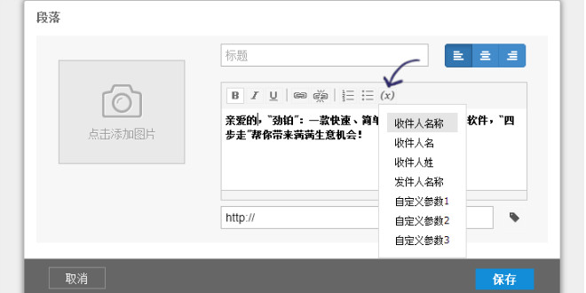 例如,在编辑“段落”时,可将光标移动到要插入客户名词的位置,然后点击下图箭头指向的这个图标,选择“收件人名称”,保存即可。