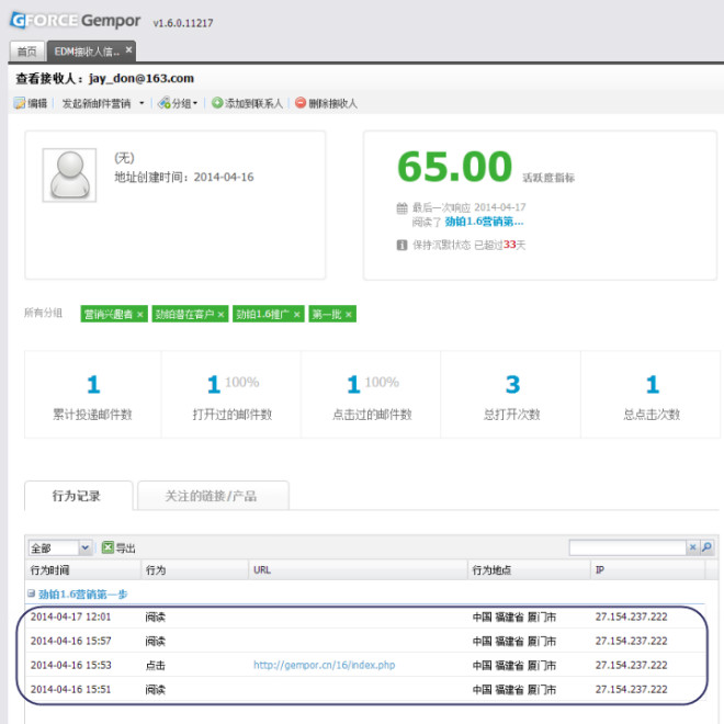 即可进入邮件地址信息查看界面,下方可查看该接收人的所有营销行为记录。